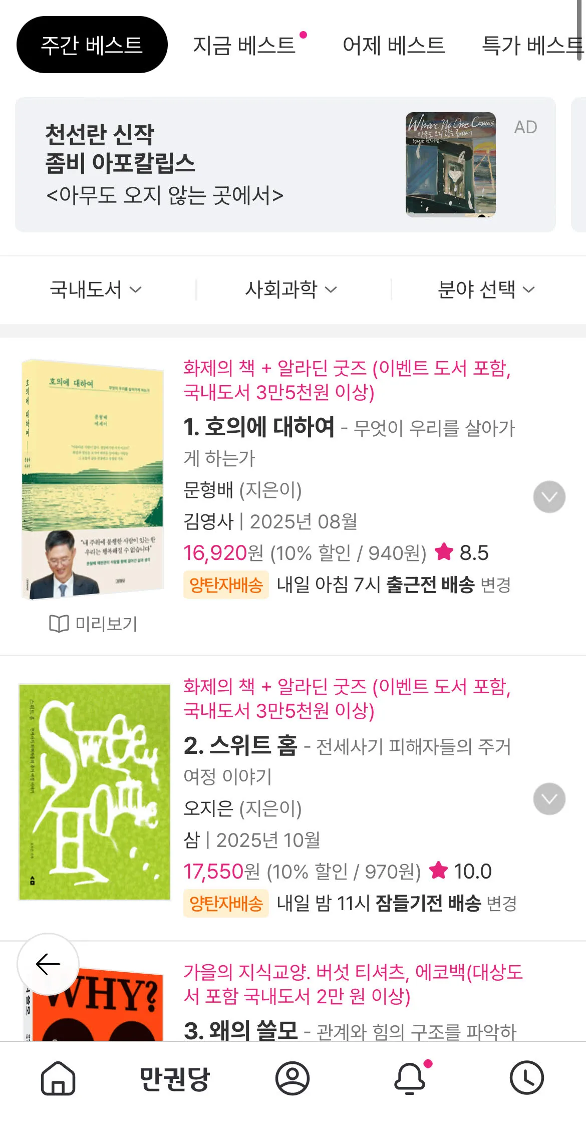 『스위트 홈』이 알라딘 주간 베스트 사회과학 분야 2위에 올랐습니다.